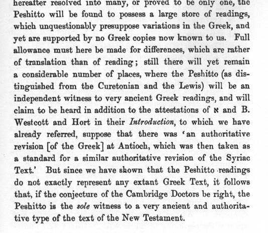 Aramean kielisen uuden testamentin valmisti George Henry Gwilliam, käymällä läpi kaikki British Museumin arkistojen tekstit, ja evankeliumit julkaistiin kirjana "Tetraevangelium Sanctum", latinan kielisellä kommentaarilla, 1901. Koko ”uusi testamentti” ilmestyi 1905. 1950-luvulla löytynyt Codex Khabouris menee hämmästyttävän merkilleen tämän mukaan. Teksti sinänsä ei ole mikään uusi asia, vanhin tiedetty aramean evankeliumikirja, Bagdadista löydetty, päättyy sanoihin "Aggaeus, apostoli Taddeuksen opetuslapsi, vuonna 78". (Asseman, Bibliotheca Orientalis). Assemanin teos kertoo myös Apostolien teoista, aramean kielellä. Epiphanius (Pan.30) mainitsee samoista kirjoista 300-luvulla genizassa Tiberiaassa. Genizaan ei laitettu kreikan kielisiä tekstejä. Siis kirjavarasto, johon laitettiin "Jumalan nimen" sisältämät teokset, jotka olivat kuluneet tai muuten käytöstä poistettuja. Alkuseurakunnan raamattuna oli nimenomaan meidän vanha testamenttimme, evankeliumikirjat sekä "apostolien teot", ja jonkin verran muita kirjoituksia, mm. Eenokin kirja. Paavalin kirjeet tunnettiin jo 100-luvulla erillisenä kirjana. Osa kirjeistä ja Johanneksen ilmestys olivat olemassa erillisinä teksteinä. Oman suomennokseni pohjatekstinä on periaatteessa J.Gwynn ”The Apocalypse of St. John in a Syriac version hitherto unknown” (1897). Sekä Gwynn, että Gwilliam, käyttivät vuosikausia etsiessään kreikan kielisiä käsikirjoituksia, joista nämä tekstit olisi käännetty – niitä koskaan löytämättä. Tässä esimerkkisivu Gwilliamin teoksesta ”Analecta Gorgiana, Vol.4” (Oxford University Press, 1903);